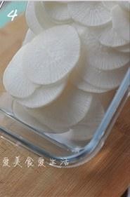 再放小半汤匙白糖,拌匀腌半小时,挤干水分.再重复一次.也就是说,先用盐腌一次,再用白糖腌两次.然后把萝卜的水分挤干。