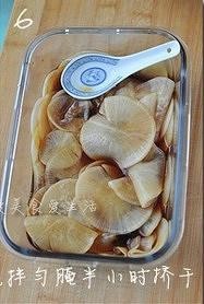 拌匀,调料汁的量要跟萝卜齐平,萝卜可以基本都泡在汁里面为准.放好调料汁可以尝下味道,自己再调节下.然后盖上盖子,放冰箱冷藏腌制两天左右,即可取出食用.