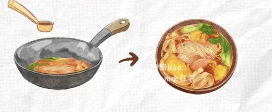 烧油放入切好的番茄,炒出沙,加入适量清水,开锅后放入豆皮、火腿、金针菇、鸡蛋,煮三分钟