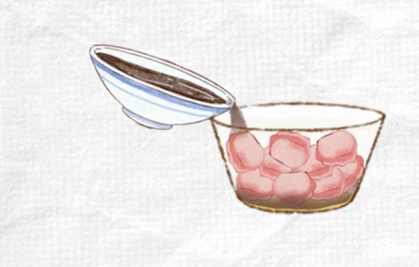 将鸡肉洗净切块,放入碗中了。加入老抽、生抽、耗油、淀粉,抓匀腌制一段时间