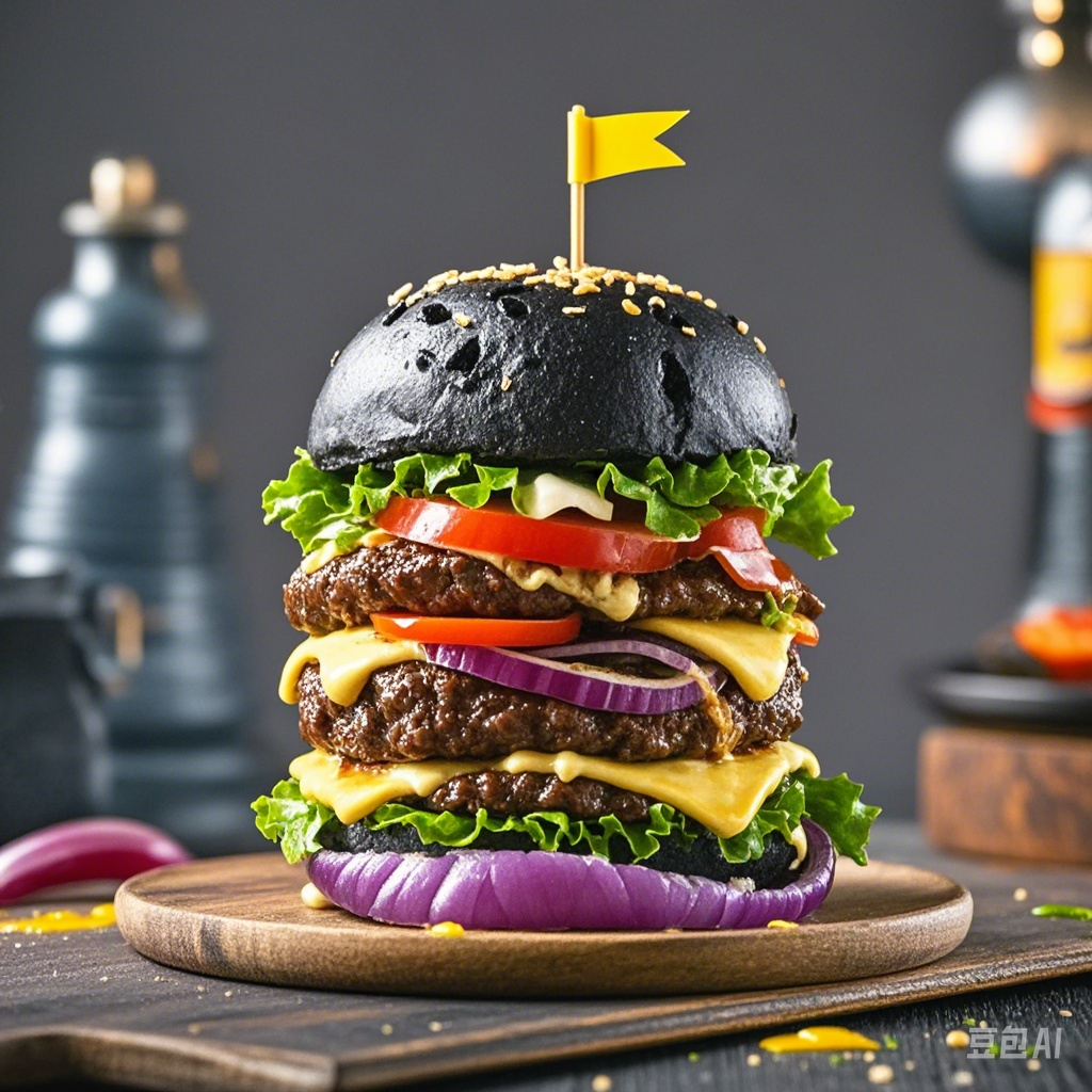 组装汉堡: 将竹炭面包切开,先放一片芝士,然后放上煎好的牛肉饼,依次放上生菜、番茄片、紫色洋葱圈,最后淋上魔法酱。