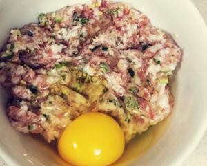 选择一块肥瘦相间的猪肉,放上生姜和小葱一起剁成肉泥,加入一个鸡蛋,料酒,淀粉,生抽,食用盐,白糖,香油,鸡精一起搅拌均匀,放一点玉米油和纯净水稀释一下,以免肉馅太干口感不细腻(家里做圆子馅也可以这样调料),然后放置一会儿