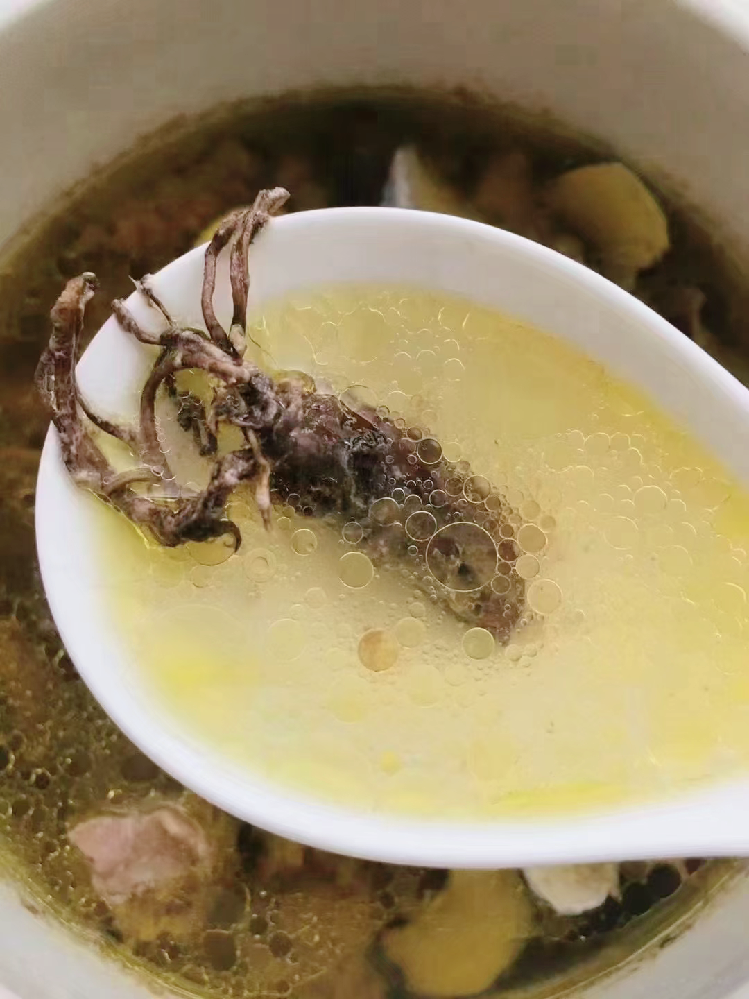炖煮两个半小时,鸡汤金黄透亮,味道鲜美,配上大虫草,营养价值极高!是一道不可多得的补食。