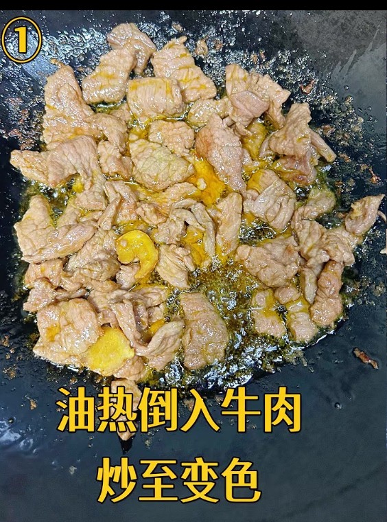 热油倒入牛肉炒至变色