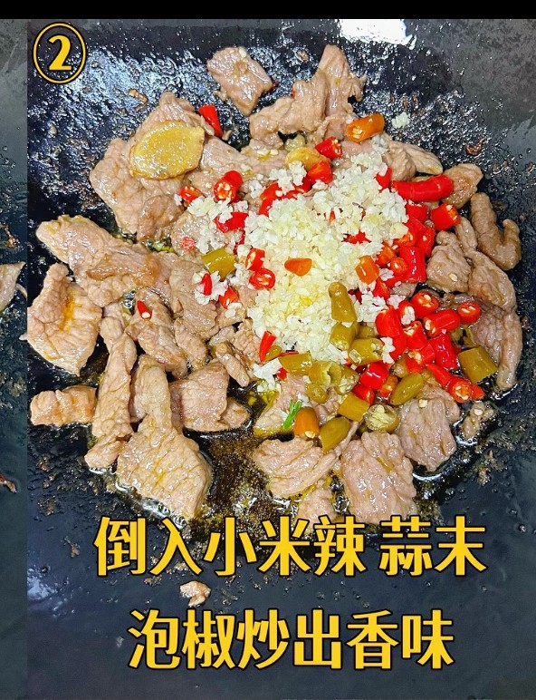 倒入小米辣 蒜末 泡椒炒出香味