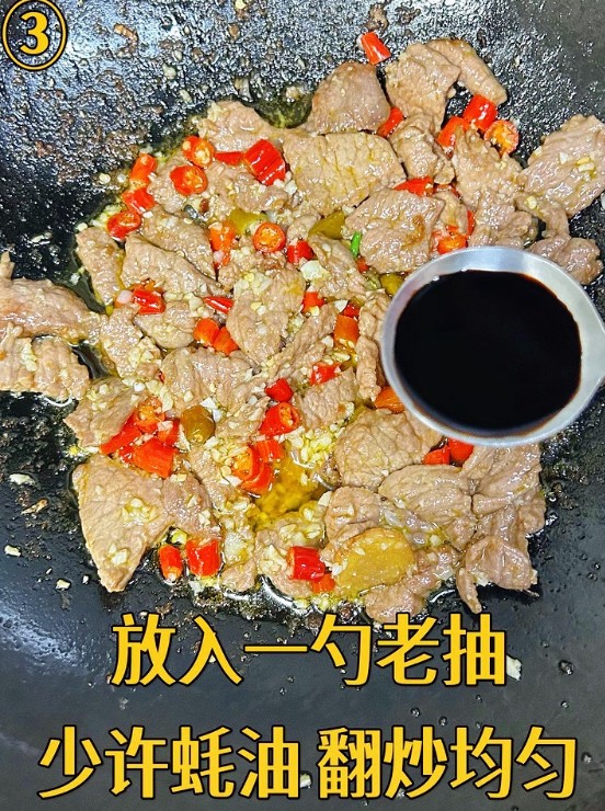 放一勺老抽 少许蚝油 翻炒均匀