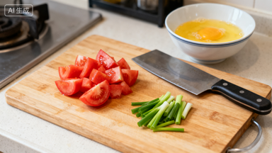 准备食材,番茄切块,鸡蛋打入碗中搅匀,葱切段。