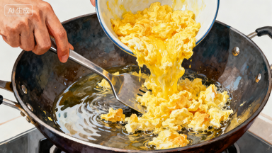 热锅倒油,倒入蛋液,快速炒散至凝固后盛出备用