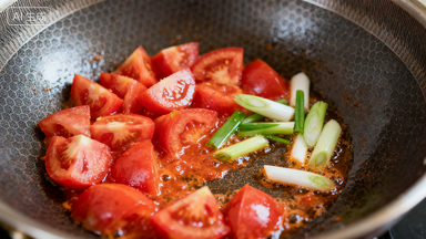 锅中留底油,放葱段爆香,加入番茄块翻炒至出汁