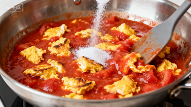 倒入炒好的鸡蛋,加盐、少许糖调味,翻炒均匀即可出锅