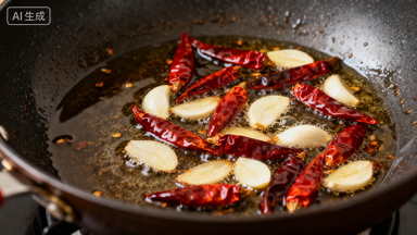 土豆丝捞出沥干,热锅冷油,放入干辣椒、蒜片爆香。