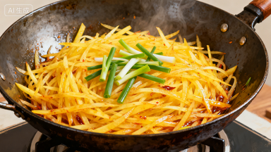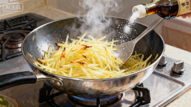 倒入土豆丝快速翻炒,加醋、盐调味,继续翻炒至土豆丝变软