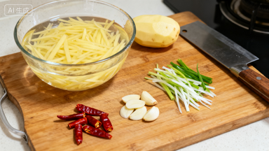 准备食材,土豆去皮切成细丝泡在清水中,干辣椒剪段,蒜切片,葱切丝。