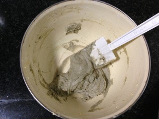 将低粉、抹茶粉和泡打粉混合筛入碗中,用刮刀拌匀