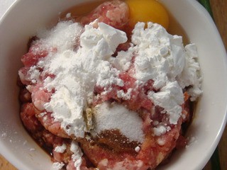 猪肉馅用盐、味精、香油、姜汁、生抽、花椒面、一个鸡蛋、适量淀粉拌匀