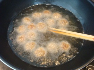 锅中烧油,把猪肉馅团成一个一个的丸子形状,入油锅炸至金黄捞出