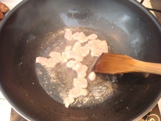 锅中放入熟猪油,下鸡胸肉丁煸炒,待肉丁变色后,再加入少量姜汁和料酒