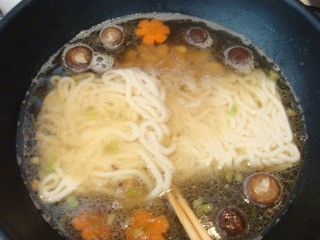 锅中填入清水,下入乌冬面,煮5分钟,肉丸可以下锅煮一会,也可以出锅时再放,出锅时撒入盐和味精,淋入几滴香油即可
