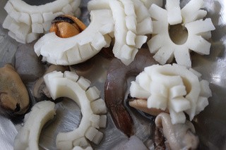 虾去壳,鱿鱼花洗干净。倒入过滤好的鸡汤中,煮5分钟左右,再放入步骤一中的蛤蜊肉,关火。隔冰水凉凉。