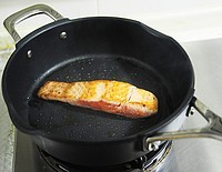 腌好的三文鱼取出,加热平底不粘锅,放入三文鱼中火干煎,因为油脂丰富,不额外加油也可以,火不要太大,鱼可以稍微老一点点。