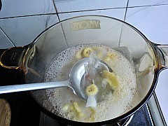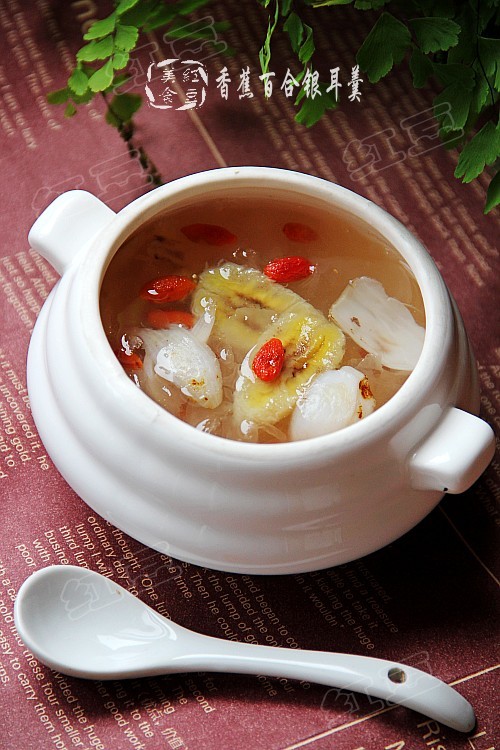 银耳撕成小块在用小火炖煮至浓滑,银耳羹的口感才好。 香蕉不要提前去皮切片,以免氧化发黑,最后放入香蕉,稍微煮开即可关火。