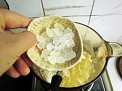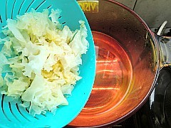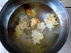 把泡发的银耳撕小块洗净倒入汤锅中加入适量的清水。
