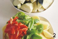 将土豆去皮滚刀块。长茄子洗净后去蒂,带皮切滚刀块儿。青红椒去蒂去籽后,切成三角形。
