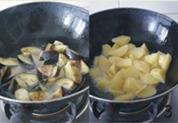 将茄子和土豆用微波炉高火转2、3分钟。然后油锅放少许油,将茄子略炸1分钟,土豆炸2分钟至表皮有些许泛金黄。青红椒炸20秒左右。