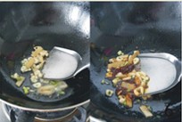 锅中留一些底油,大火加热,待油7成热时,放入葱姜末和一半的蒜末,炒香之后,再放少许郫县豆瓣酱炒匀(郫县豆瓣酱可不放)。