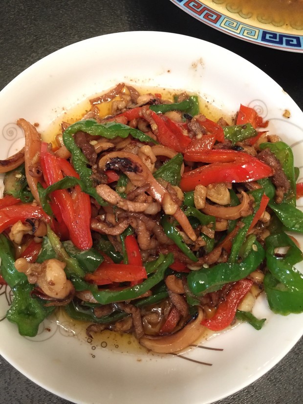 猪后腿肉切丝。青红辣椒切丝。蒜瓣切碎。以上备用。 坐热油锅,爆香蒜子,下肉丝翻炒至肉丝变色。 倒入墨鱼丝。翻炒两下后加入香醋,耗油,酱油,糖。不时的少量多次加水。