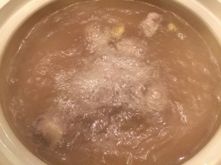 开始煲汤,烧开350ml的水,把洗干净的排骨放进开水里去血腥后,捞起来沥干