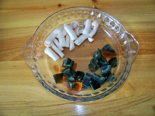 皮蛋切粒,海鲜菇切小段待用