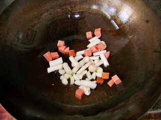 六成热时下蒜子、火腿、海鲜菇煸炒出香