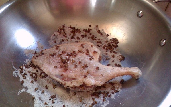 再将鸭腿放入炒好的椒盐里,鸭腿的正反面均匀的沾上椒盐,然后放置盆里腌制一个晚上