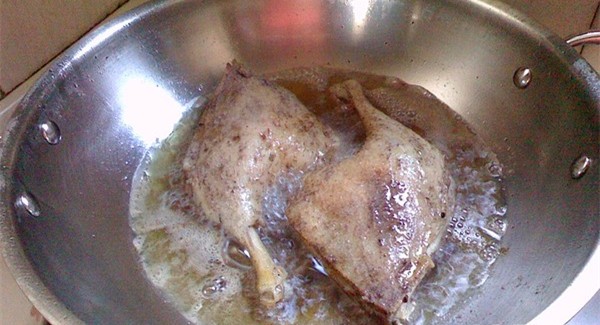 锅内热油,油烧至7成热时,把鸭腿放入炸至表皮金黄酥脆即可