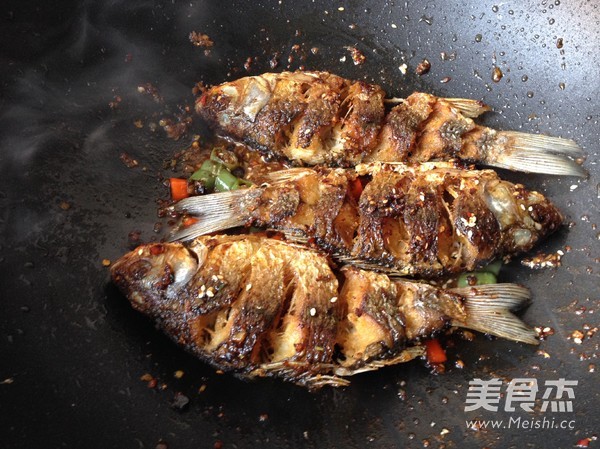 10.将炸好的鲫鱼下入锅中,倒入少量水焖2分钟即可