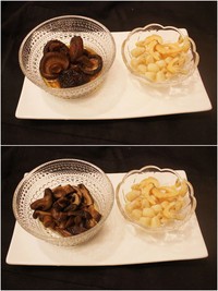 干香菇洗净放一碗水泡发,切条。瑶柱虾米提前浸泡2小时。(香菇水不要倒掉,等下用来炒肉和蒸饭)
