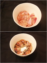 鸡腿洗净,用剪刀直接把鸡肉剪成鸡丁块。然后加入少许生抽,蚝油,胡椒粉,盐生粉腌制10分钟。