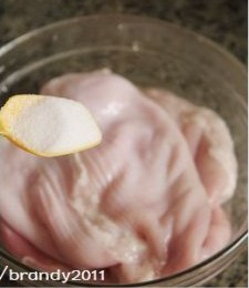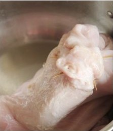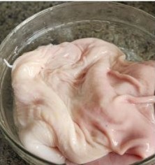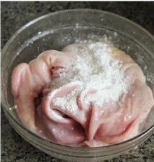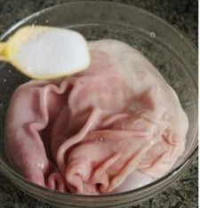 在加入盐三小勺,还是用两只手猛抓猪肚,抓呀抓,然后用自来水冲干净,反复这样的程序2-3次