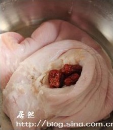 把红枣十粒,适量枸杞子,和胡椒塞进猪肚