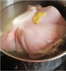 锅中放水,放入酿好的猪肚鸡,加几片姜片,少量料酒,先焯水一次