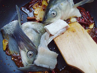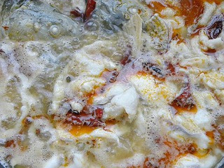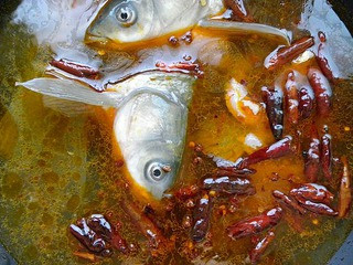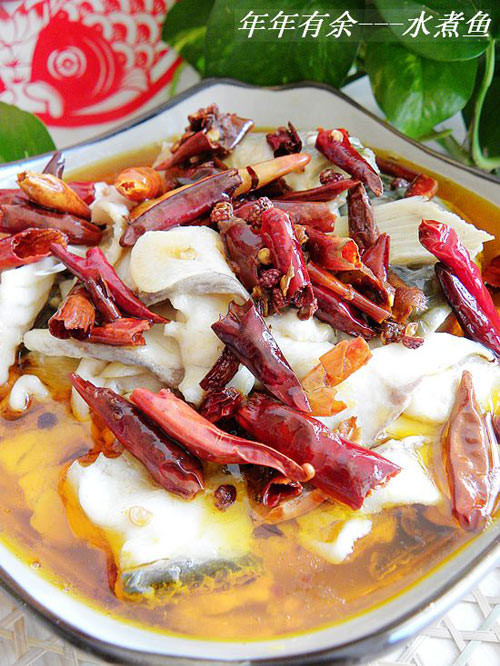 煮到鱼片变色至熟,约1~2分钟,即可。将事先盛出的花椒、辣椒铺于碗中,淋入热油即可。