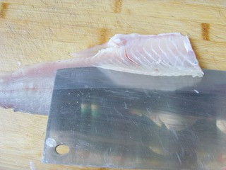 将草鱼去腮、内脏处理干净。切下头、尾留用,沿中间鱼骨将鱼肉片成两片。鱼皮朝下,斜刀切除鱼身的大刺片,再切成薄厚适中的鱼片。