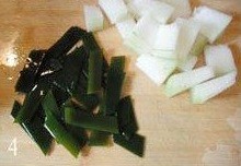 4.冬瓜洗净,把皮、瓤去掉,切成大块(小块易化掉,影响汤的清爽度);海带洗净切片或丝都行;香葱切粒备用