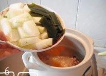 6.把冬瓜、海带放进去,调入适量精盐,大火煲沸改小火煲15分钟;