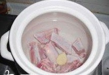 2.把焯好的排骨放进烧开水的砂锅里,放进姜片,先用大火煲沸,改小火慢慢炖1个半小时;