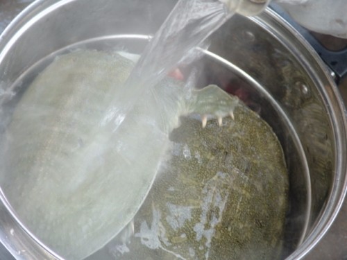 水鱼买时让卖家收拾干净,回家再滚水略烫,甲的部分也要刷净。