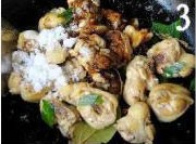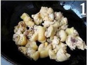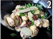 锅中倒油烧热,放鸡肉略炒,再加入葱姜、香叶、大料、桂皮炒出香味