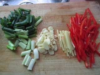 将辣椒洗净切小条,葱洗净切段, 蒜去皮拍碎,姜切丝