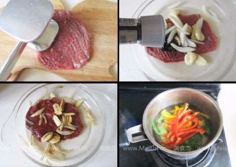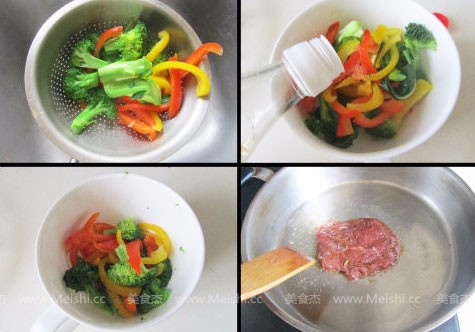 将牛眼肉用小铁锤敲打,放入洋葱, 大蒜, 蚝油。 盐和黑胡椒放入肉中。搅拌均匀后腌制十分钟。将西兰花和彩椒放入加了点盐和油的开水中焯一下